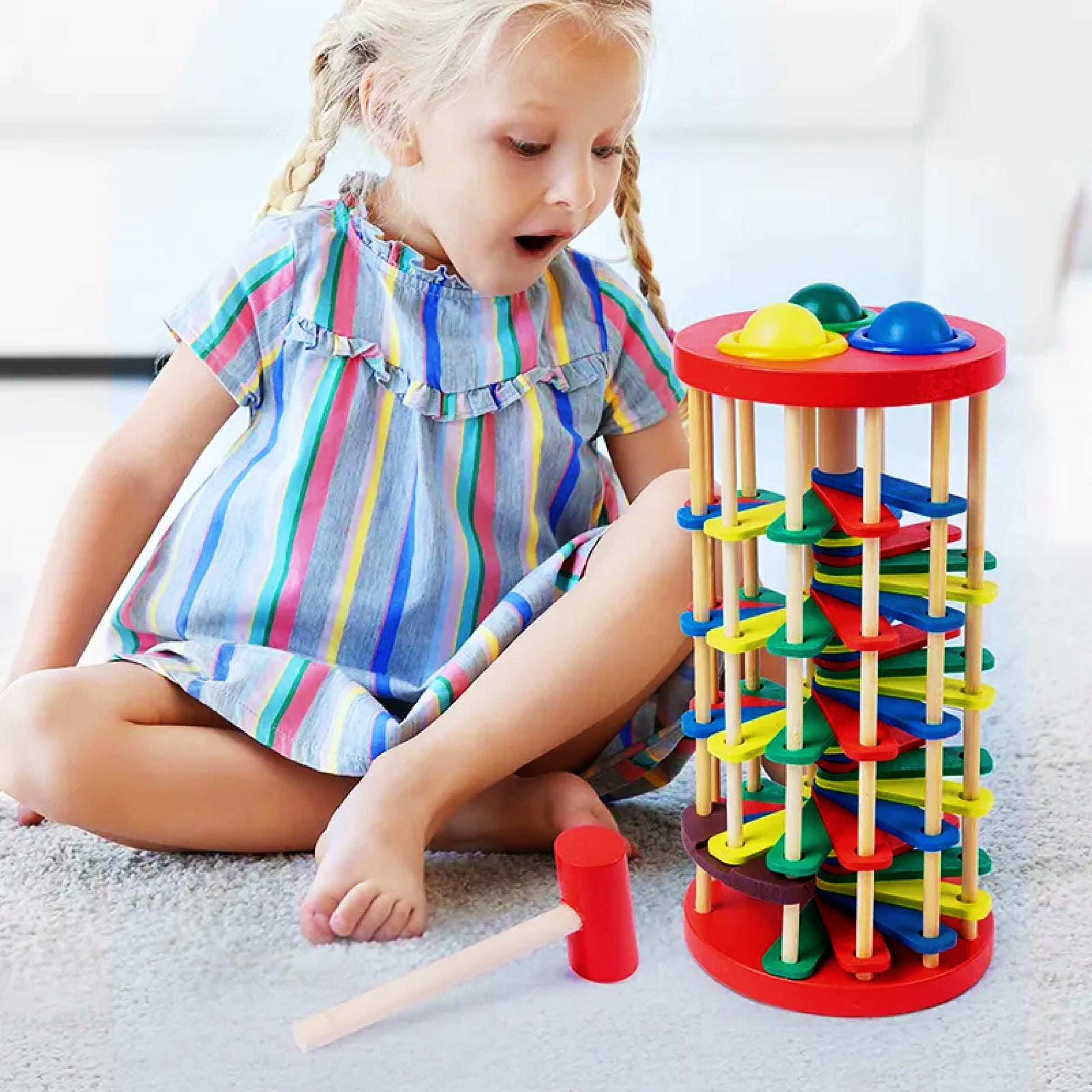 Pound and Roll Wooden Tower – Colorful Hammer & Ball Toy